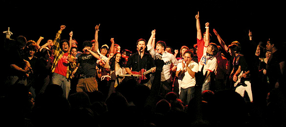 But there are moments of hope as well. On “8 ½ minutes” when faced with the impending nuclear Armageddon, Morrison concedes that there’s cruelty and selfishness in society, but also love and forgiveness. “Back and Forth” is a triumphant finale in which Morrison proclaims he’s still “in search of the moment between the seconds where everything is just fine” and that together, we will “shrug away what we can’t bear.” On some level, the Dismemberment Plan’s very existence validates our daily struggle to stay afloat. By sharing their feelings of alienation, the band’s fans are among the tightest knit bunch you’ll ever see, as evidenced by the “can you believe we’re all here?” giddiness witnessed at the band’s reunion shows. It’s hard to think of a more communally cathartic moment than being in the audience seconds before the explosive climax of “You Are Invited,” the entire crowd like a cocked cross bolt poised to be fired upward in delirious joy. By end of these shows, a hundred fans surround Morrison on stage , swaying, bouncing and singing every word in raucous celebration. You see, in the end, in spite of the discomfort and disaffection, it’s important to remember that we are invited — all of us.