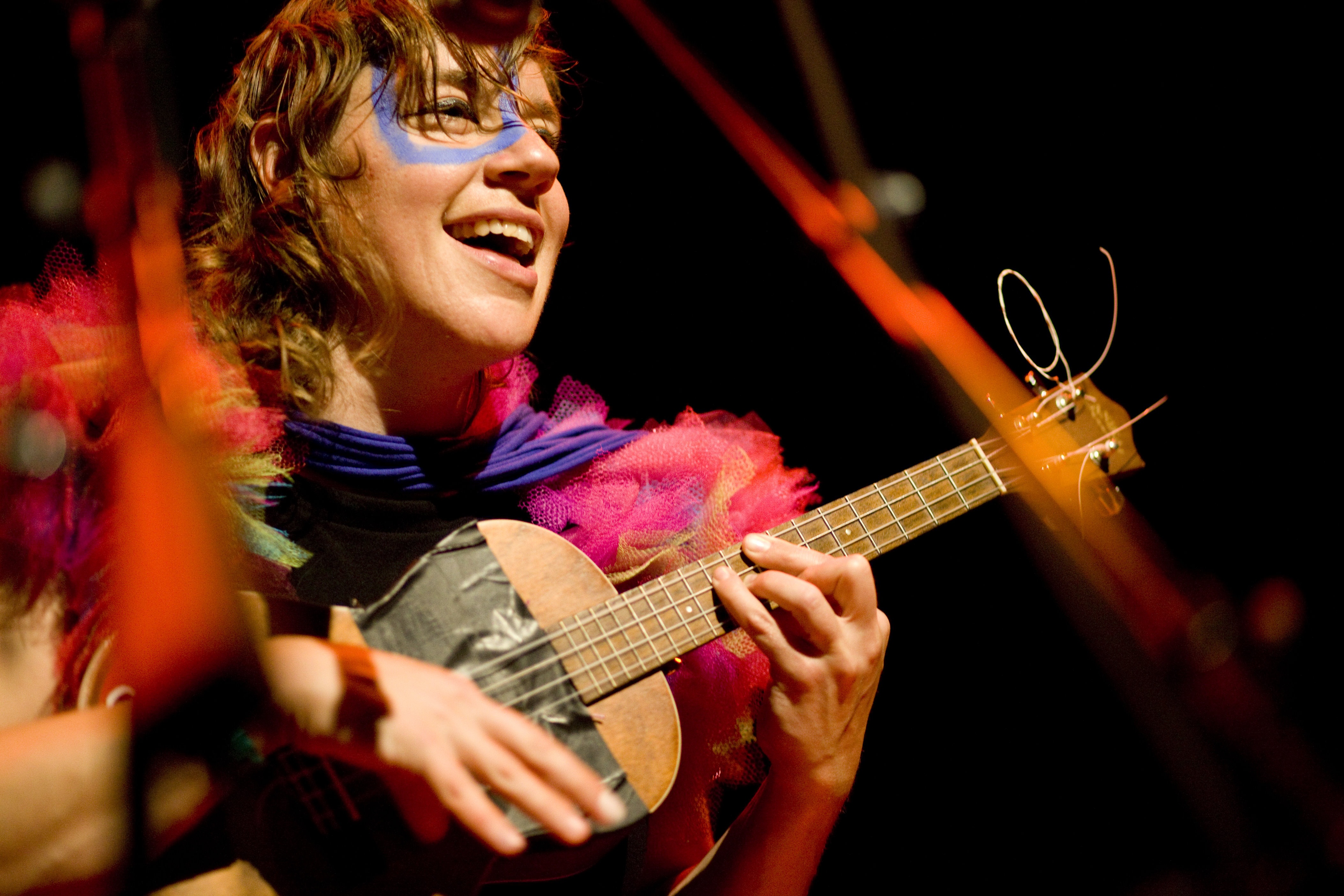 By looping percussive vocal sounds and frantic drumming into a multi-layered sonic base, Garbus is free to roam concert stages like a banshee, scatting, screaming and caterwauling melodies while simultaneously strumming a ukulele and dancing to tUnEyArDs’ blaring horn section. Her energy and message are jubilant, furious, and infectious all at once. “Gangsta” cries foul over stereotypes, “Bizness” rails against addiction, and “Powa” is an explosive feminist credo. Before concerts, Garbus dons a defiant streak of tribal face paint, almost as if she headed out to war. In a sense, she is. “My country ‘tis of thee/Sweet land of liberty/How come I cannot see my future in your arms?” belts out Garbus, but moments later slyly adds a disclaimer “Not yet.” That time is coming, and tUnEyArDs’ time is now.
